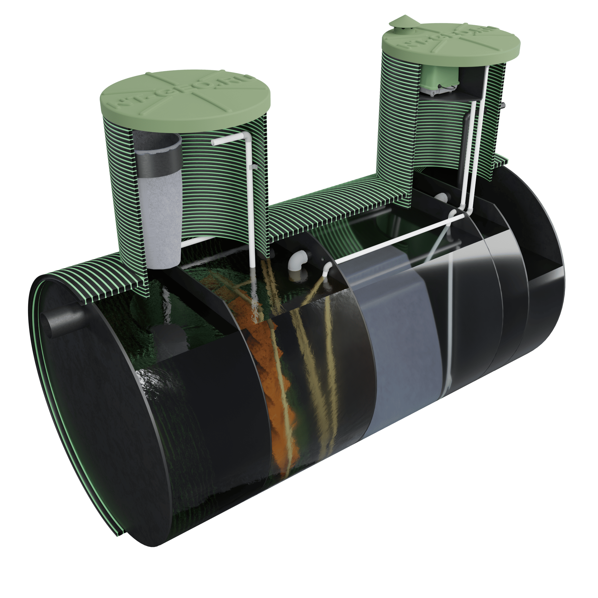 Автономная канализация НТ БИО 2н представляет собой цилиндрическую емкость из прочного износостойкого полиэтилена, разделенного на несколько отсеков. Каждый из них отвечает за выполнение определенного этапа очистки:
